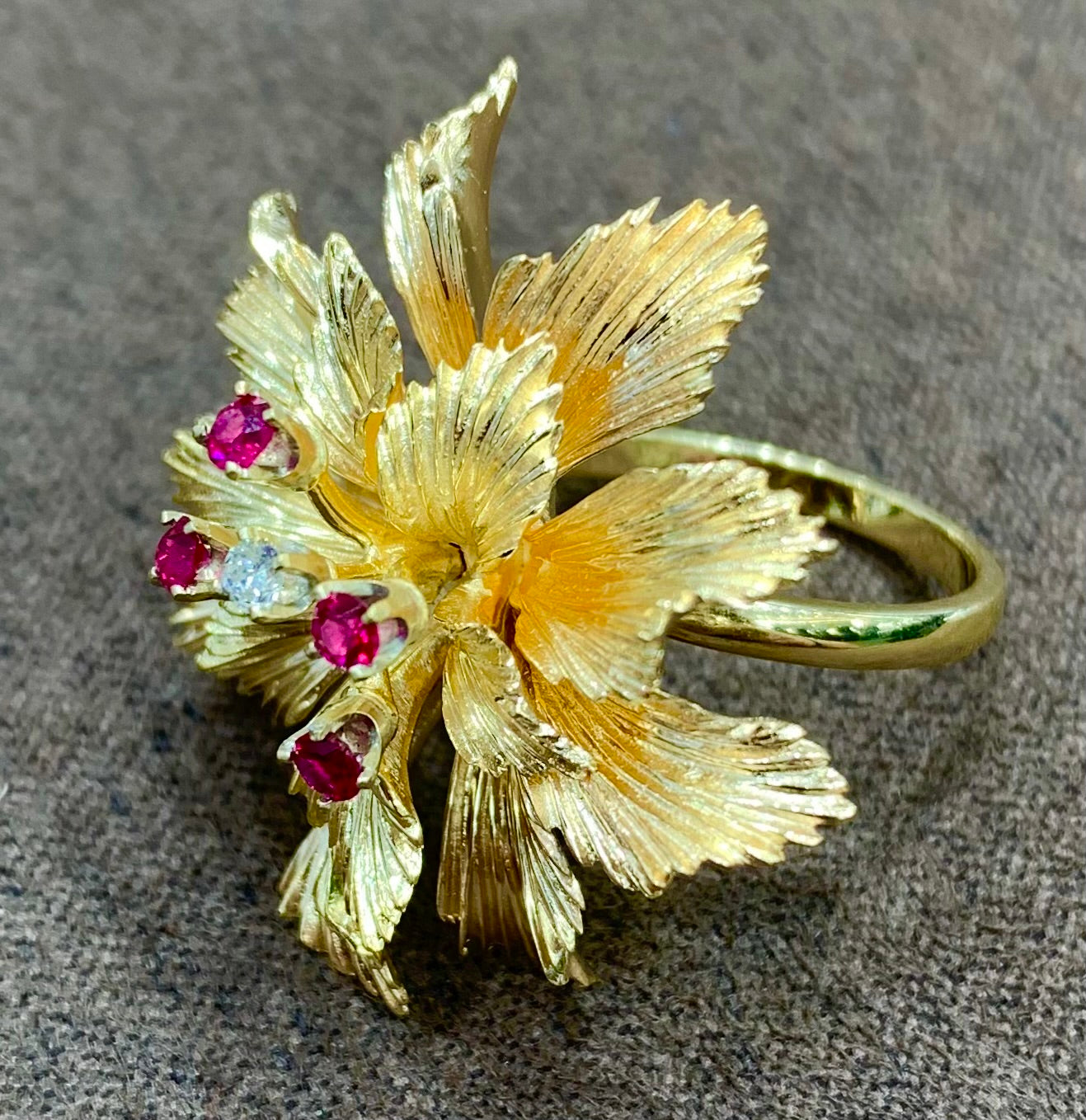 A gold, ruby and diamond flower ring. Diamond, rubies, estimated gross weight 11.7grams, mounted in 14kt gold, measures 1 3/8 in.