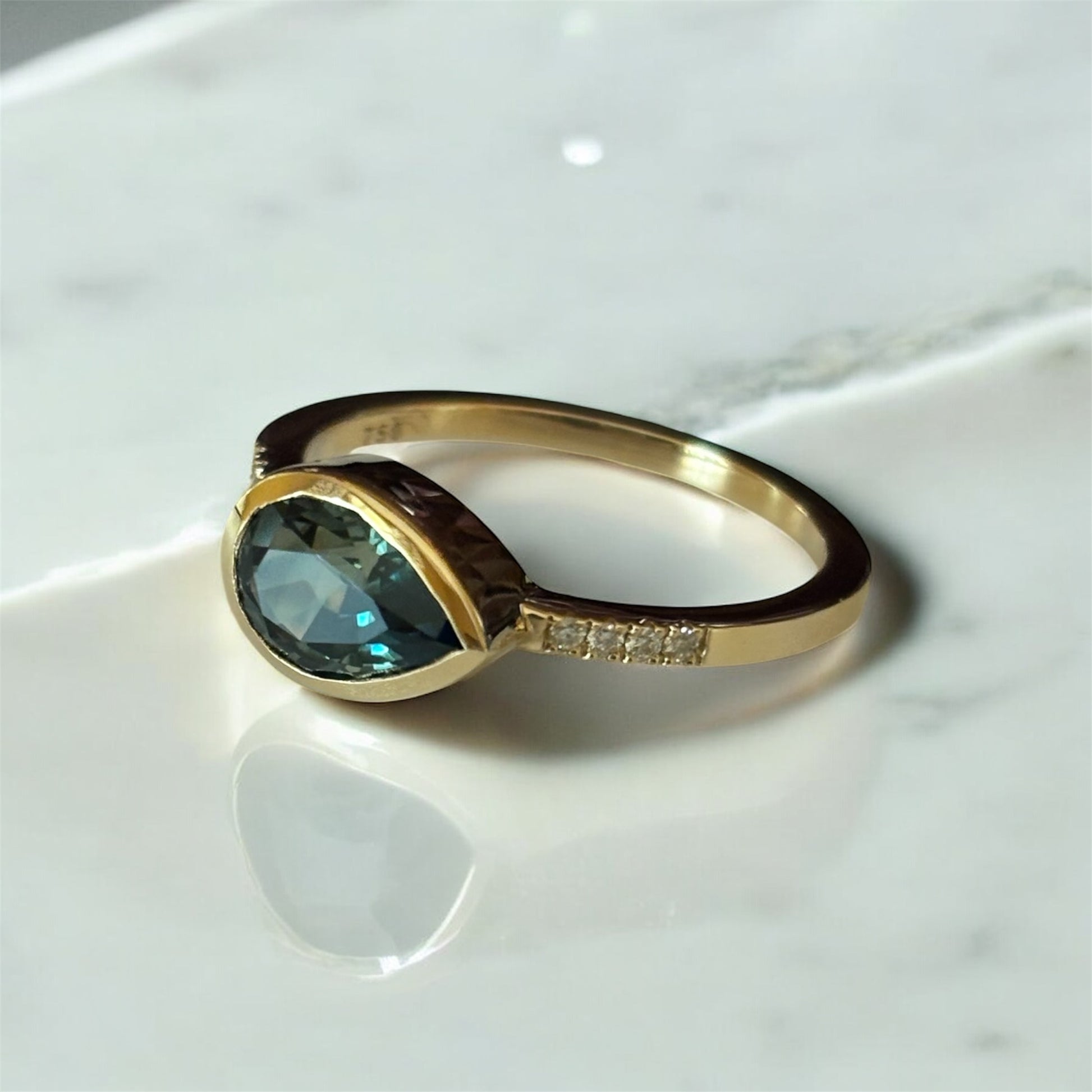 Beautiful teardrop and diamonds ring in 18kt gold with a teal colored Australian Parti Sapphire. Ring is sized at 7.5. Gwt - 3.42gms and Sapphire is 1.59cts.