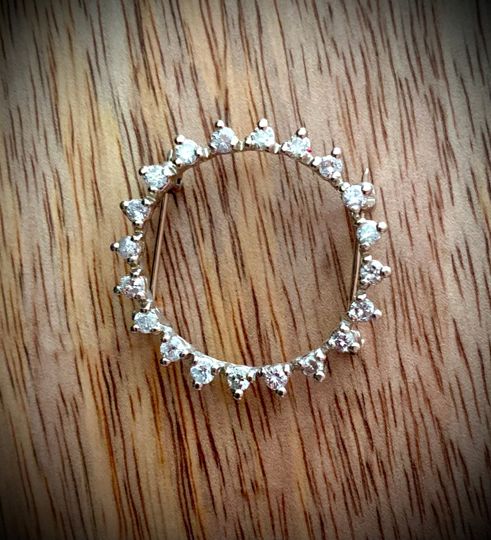 Beautiful diamond and white gold pendant on a white gold chain of 20inch in length. In its former glory, it was a diamond brooch and an image is shown here. Diamonds weighing approx 0.80carat, estimated gross weight 4.6grams, mounted in 14kt white gold, measure 1 1/8 in.