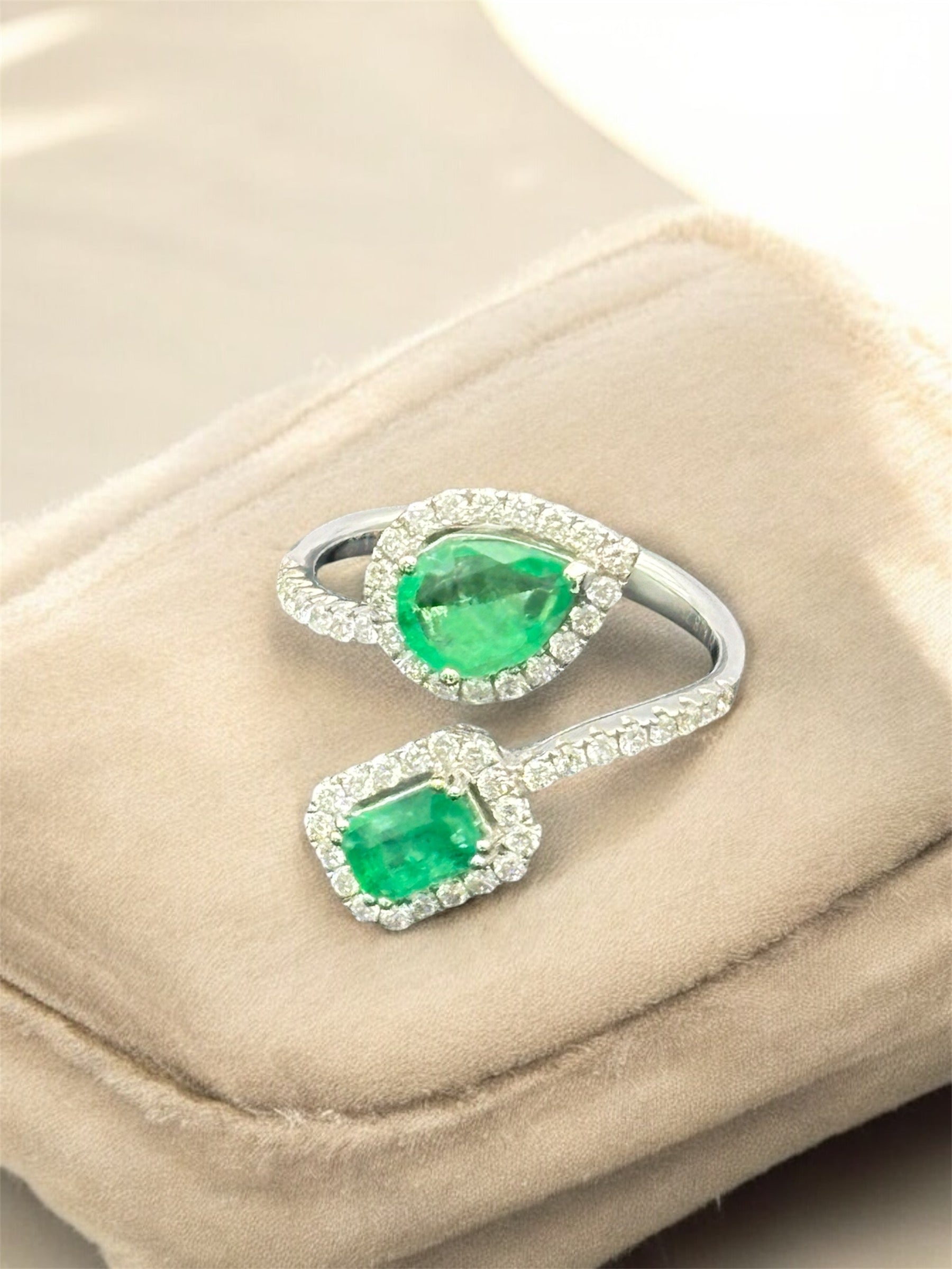 18kt white gold, diamond and emerald ring. Bright green emeralds and sparkly diamonds - for the love of your life….